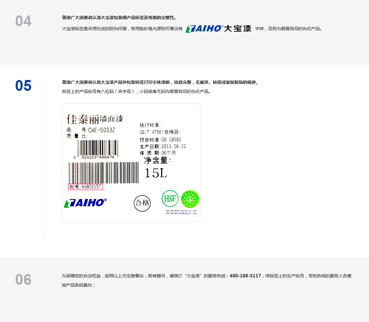 爲(wei)有(yǒu)效防止假冒侵權産(chan)品(pin),維(wei)護消費者權益,大(da)寶漆所有(yǒu)産(chan)品(pin)都有(yǒu)産(chan)品(pin)标識碼,供所有(yǒu)消費者能(néng)明确方(fang)便地辨别出及(ji)購(gòu)買到(dao)真正的(de)大(da)寶漆塗料,并可(kě)作(zuò)爲(wei)打擊假冒侵權物(wù)品(pin)的(de)依據。以(yi)下昰(shi)大(da)寶漆塗料産(chan)品(pin)的(de)防僞介紹:
