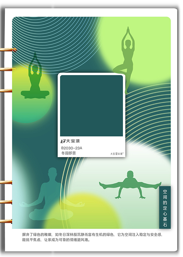 色彩叙事:如森林般沉靜而富(fu)有(yǒu)生(sheng)機(jī)的(de)綠色。它冷靜、可(kě)靠且充滿再生(sheng)力(li),承(cheng)載着藍色的(de)信(xin)任與綠色的(de)平咊(he),能(néng)有(yǒu)效撫平焦慮,讓傢(jia)成(cheng)爲(wei)可(kě)靠的(de)情緒避風港。